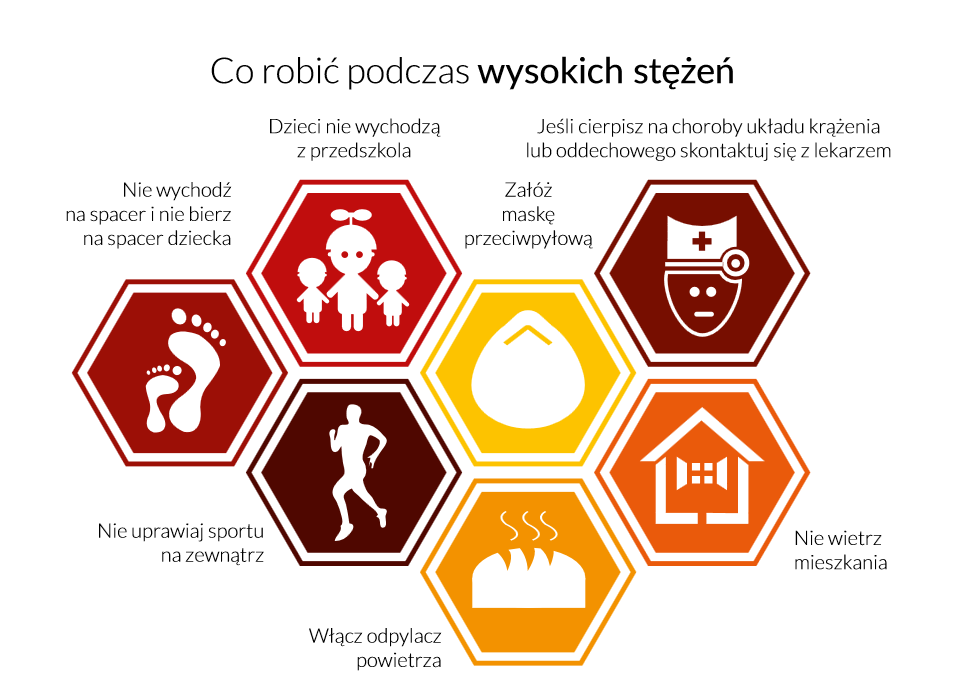 - unikać długotrwałego przebywania na otwartej przestrzeni dla uniknięcia długotrwałego narażenia na podwyższone stężenia zanieczyszczeń,
