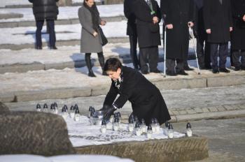 – Holokaust to zło ujawnione i namacalne. Zginęło wielu ludzi, miliony ludzi, miliony nadziei, tożsamości, marzeń – powiedziała premier Beata Szydło podczas uroczystości w budynku Sauny. – Świadczmy prawdę. Niemieckie obozy zagłady to była fabryka nienawiści i śmierci, fabryka zła, które za późno, ale jednak zostało pokonane przez dobro. Spokój duszy i wieczny odpoczynek ofiarom. Cześć i chwała bohaterom. Prawda i pamięć. Dobro zawsze pokona zło.