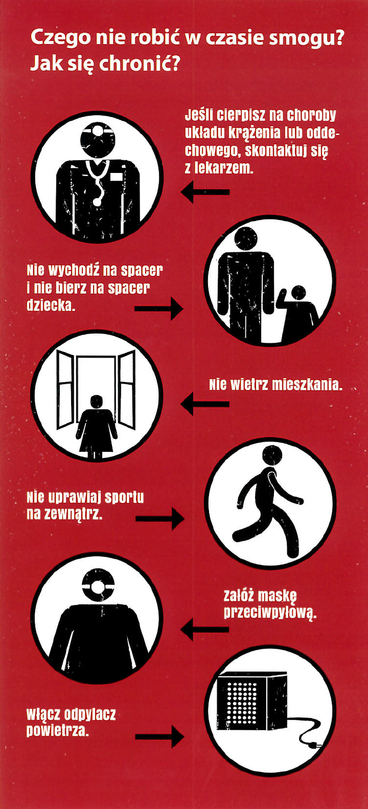 Osoby szczególnie wrażliwe na zanieczyszczenie powietrza: dzieci i młodzież poniżej 25 roku życia, osoby starsze i w podeszłym wieku, osoby z zaburzeniami funkcjonowania układu oddechowego, chorzy na astmę, choroby alergiczne skóry i oczu, osoby z zaburzeniami funkcjonowania układu krwionośnego, osoby zawodowo narażone na działanie pyłów i innych zanieczyszczeń oraz osoby palące papierosy i bierni palacze, powinny podjąć następujące środki ostrożności:
