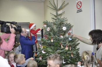 Najwyższe gałązki drzewka, które stoi w holu, są poza zasięgiem dziecięcych rączek. Nawet niektórzy dorośli mają kłopot, żeby ich dosięgnąć, dlatego niezbędna była praca zespołowa. Udało się połączyć zmysł organizacyjny i tężyznę fizyczną. Tym sposobem najmłodsi pomogli wójtowi Mirosławowi Smolarkowi ubrać świąteczną choinkę w kolorowe i słodkie ozdoby.