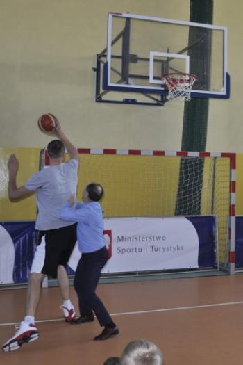 Wójt Smolarek podarował gościowi lokalne specjały: sok wyciskany z jabłek (oczywiście bez dodatku cukru) i pszczeli pyłek, a Pani Trybańskiej wręczył bukiet kwiatów. I wtedy niespodziewanie został wyzwany na koszykarski pojedynek, mini-mecz do pierwszych trzech trafień. Nierówną ale zaciętą rozgrywkę wygrał Cezary Trybański 6:2.