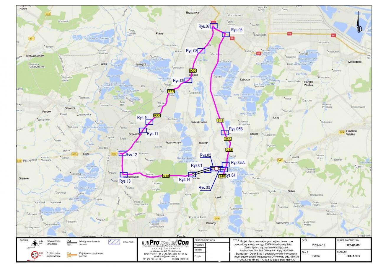 Poniżej: "Projekt tymczasowej organizacji ruchu na czas przebudowy mostu w ciągu DW 949 nad rzeką Soła. Zamknięcie z wyznaczeniem objazdów".