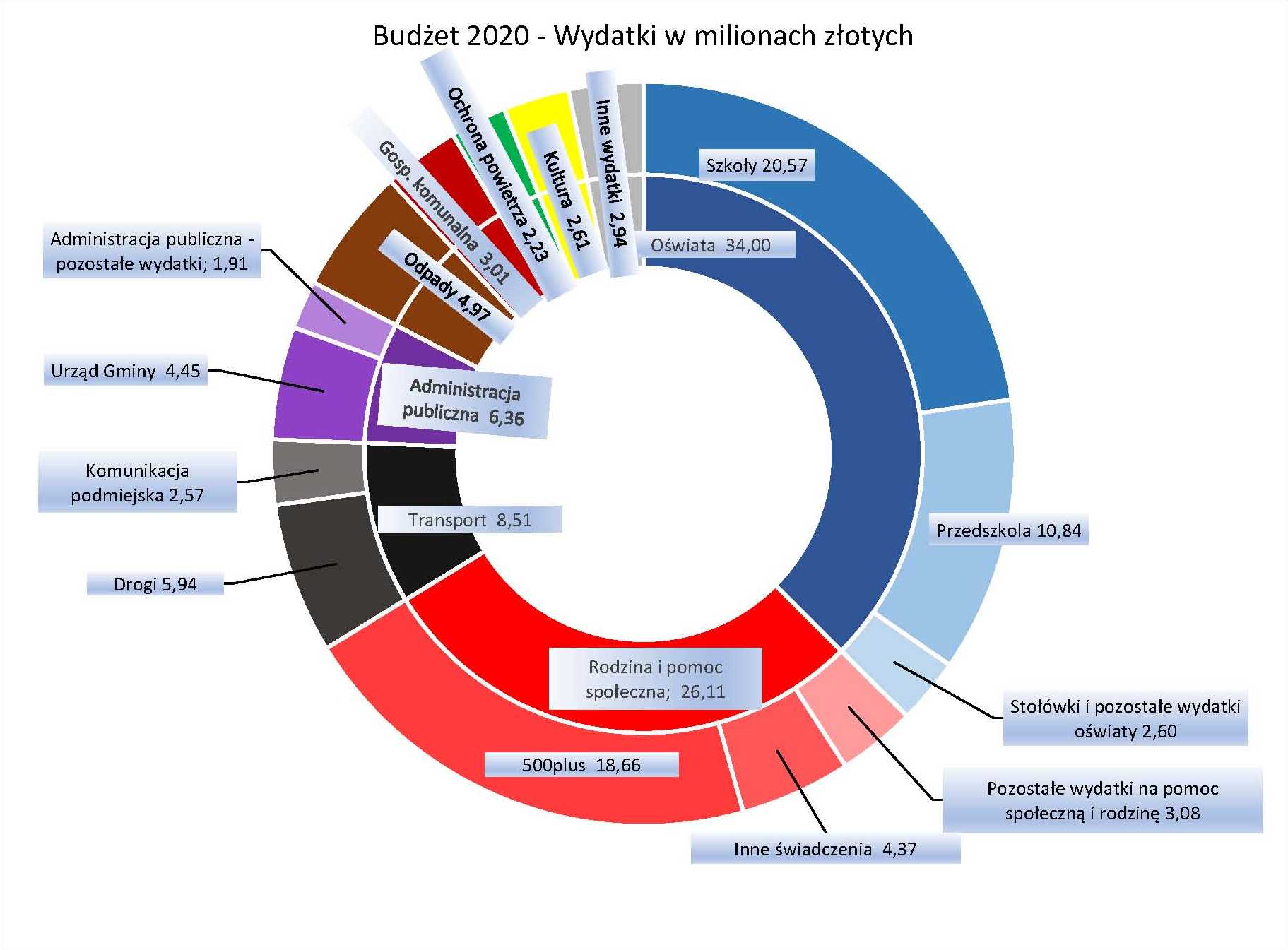 Oświata jest dziedziną, z którą wiążą się największe wydatki. W tym roku wyniosą one ponad 34 mln zł. Ta kwota zawiera m.in. koszty wynagrodzeń, utrzymania budynków, funkcjonowania szkolnych świetlic, kształcenia dzieci niepełnosprawnych i dowożenia uczniów. Nie obejmuje jednak wydatków na Samorządowe Centrum Usług Wspólnych (zapewniającego obsługę administracyjną oświaty), które na wykresie poniżej zostały ujęte w dziale Administracja publiczna. Nakłady na szkoły to ponad 20 mln, a na przedszkola – prawie 11.