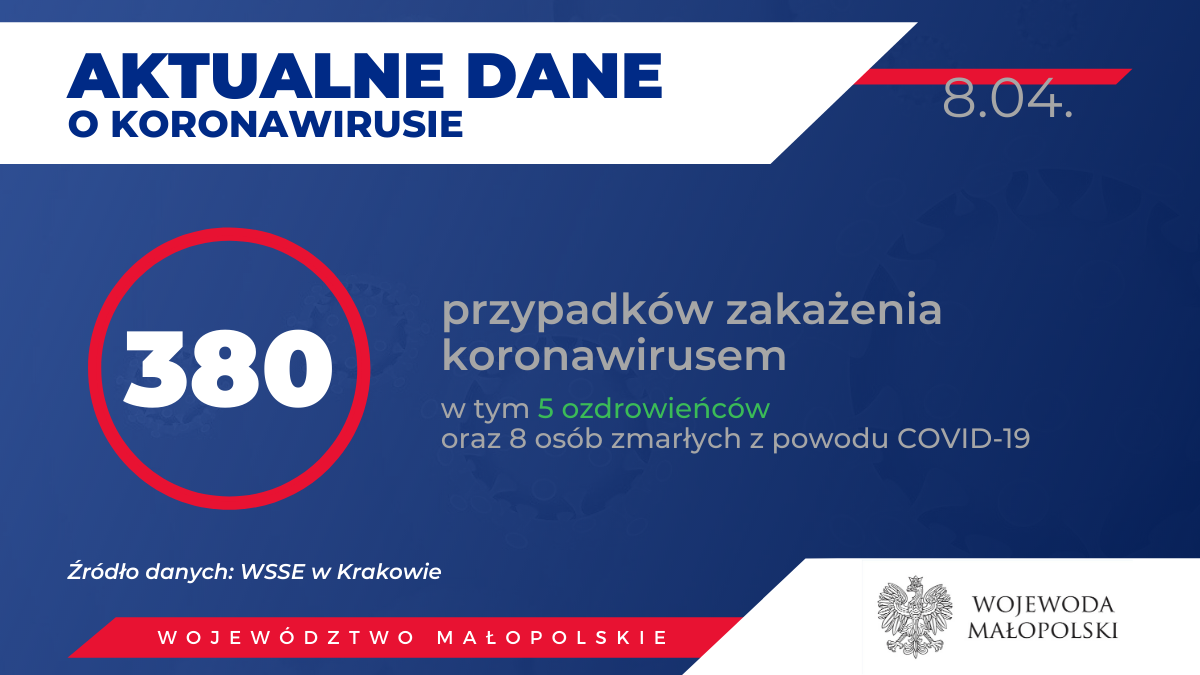 Obecnie w Małopolsce zakażenie koronawirusem zostało potwierdzone u 380 osób (stan na 8 kwietnia, godziny przedpołudniowe).