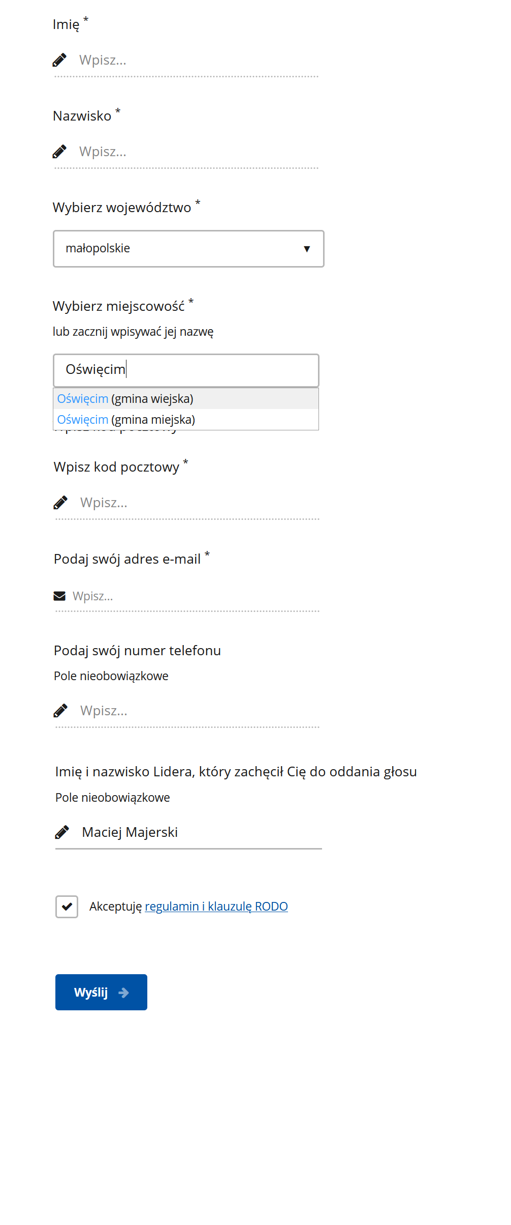 Aby oddać głos należy wejść na stronę https://bialoczerwona.www.gov.pl/ i wypełnić krótką ankietę. Po wpisaniu swoich danych, należy wybrać województwo, co ważne w polu miejscowość nie wpisujemy nazwy swojej miejscowości - należy wpisać „Oświęcim (gmina wiejska). Lokalnym lider w naszej gminie jest Maciej Majerski – Sołtys Rajska.