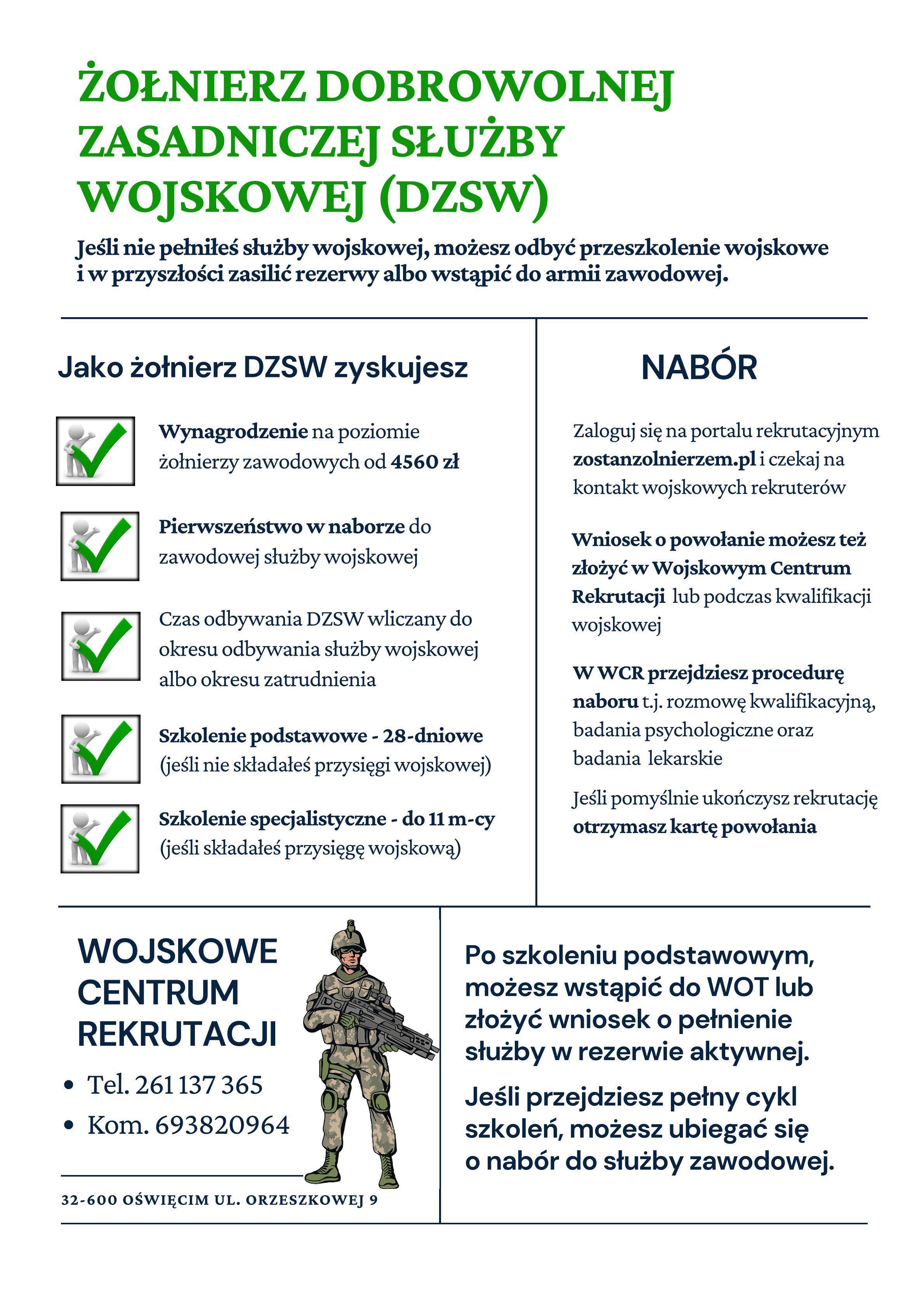 Więcej informacji na temat służby wojskowej można znaleźć na stronie internetowej www.wcroswiecim.wp.mil.pl. Zainteresowani mogą zgłaszać się poprzez stronę www.zostanzolnierzem.pl, przyjść osobiście do WCR przy ul. Orzeszkowej 9 w Oświęcimiu lub zadzwonić 262137365, kom. 693820964, gdzie personel rozwieje wątpliwości kandydatów i doradzi właściwą ścieżkę.