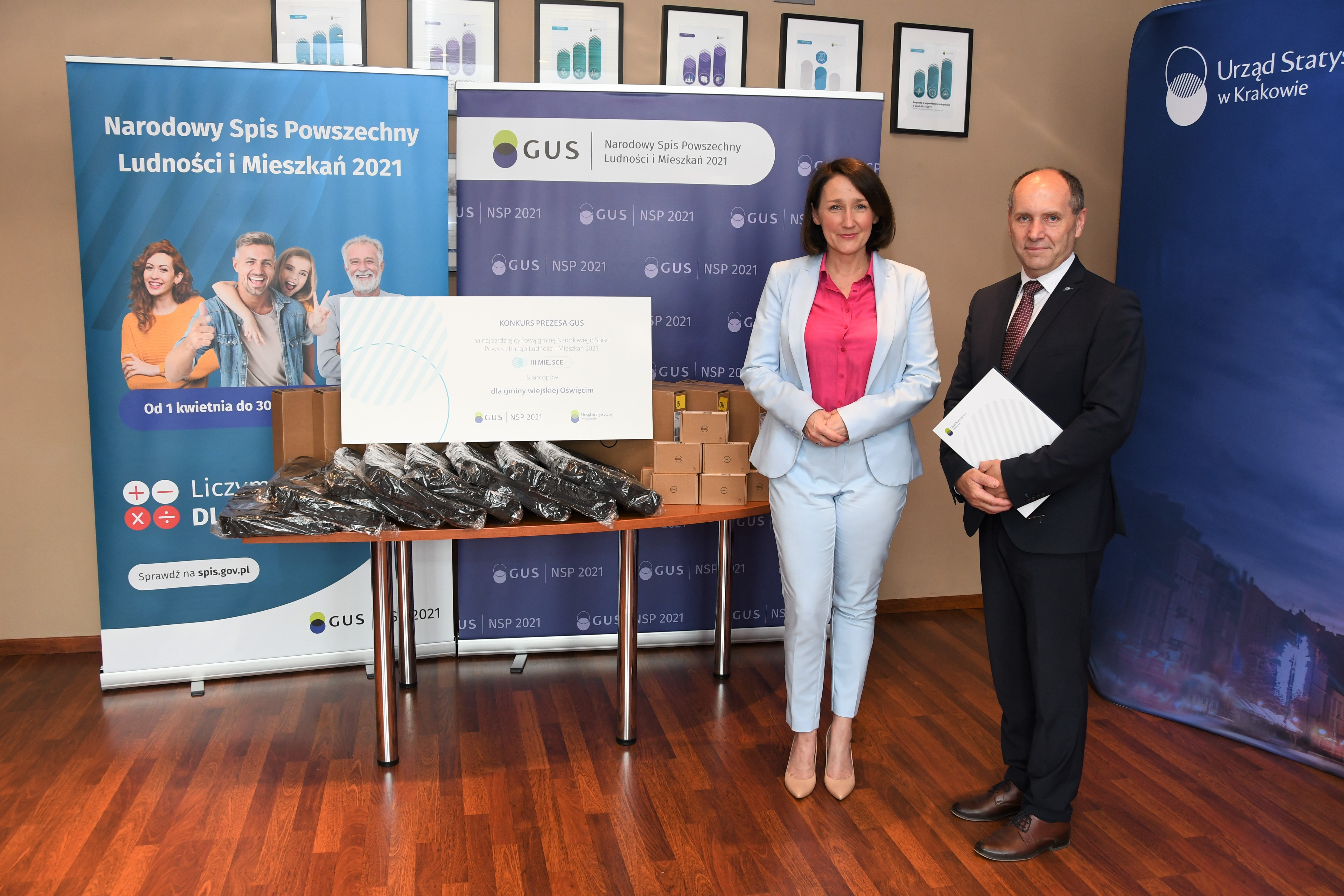Nagrodę – osiem laptopów – wójt Mirosław Smolarek odebrał z rąk dyrektora Urzędu Statystycznego w Krakowie Agnieszki Szlubowskiej 10 czerwca.