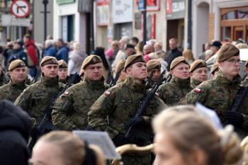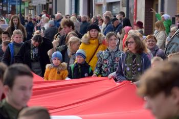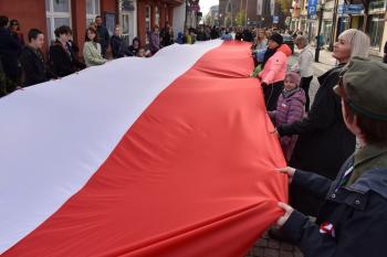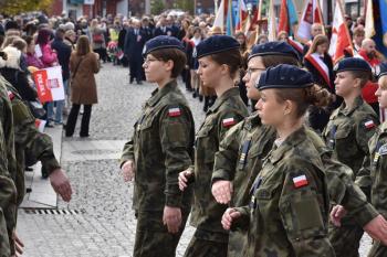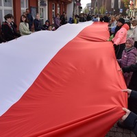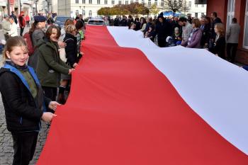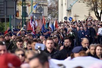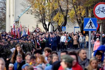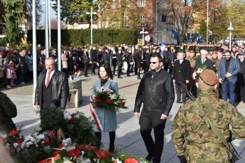 Po uroczystej mszy w Sanktuarium Matki Bożej Wspomożenia Wiernych liczny biało-czerwony korowód przy dźwiękach orkiestry wyruszył z Rynku Głównego. Wójt Mirosław Smolarek, prezydent Janusz Chwierut i starosta Andrzej Skrzypiński wspólnie złożyli wieńce przy Pomniku Niepodległości.