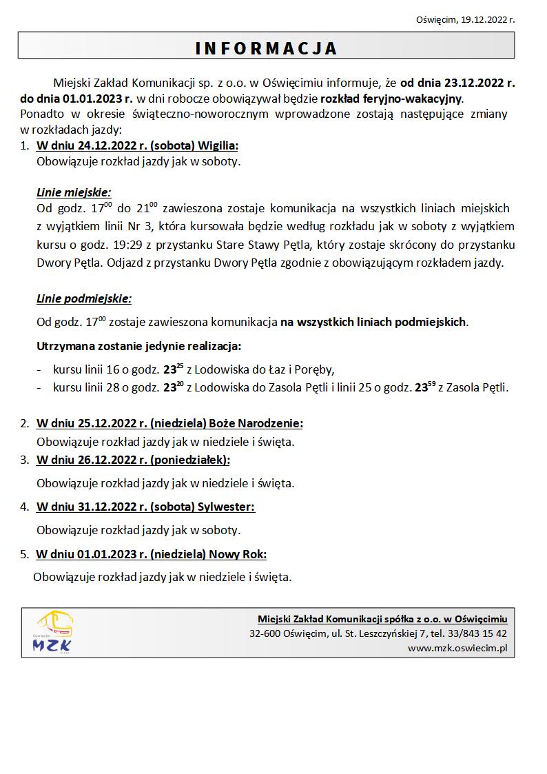 Informacja Miejskiego Zakładu Komunikacji sp. z o.o. w Oświęcimiu o rozkładach jazdy autobusów od dnia 23 grudnia 2022 r. do dnia 1 stycznia 2023 r.