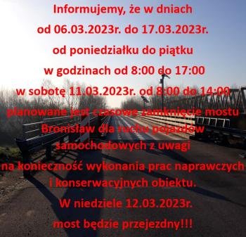 Urząd gminy Miedźna informuje o utrudnieniach związanych z czasowym zamknięciem mostu Bronisław dla ruchu pojazdów samochodowych z uwagi na konieczność wykonania prac naprawczych i konserwacyjnych obiektu.