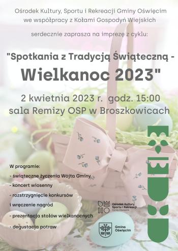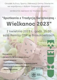 Zapraszamy na wydarzenie Spotkanie z Tradycją Świąteczną - Wielkanoc 2023, które odbędzie się w najbliższą niedzielę, tj. 2 kwietnia o godzinie 15:00, w sali Ochotniczej Straży Pożarnej w Broszkowicach.