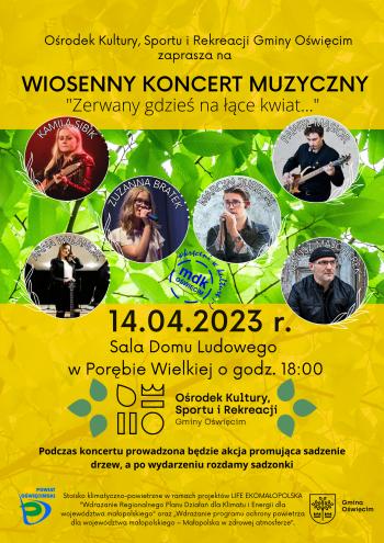 Ośrodek Kultury, Sportu i Rekreacji Gminy Oświęcim zaprasza na wydarzenie: Wiosenny Koncert Muzyczny, który odbędzie się w najbliższy piątek, tj. 14 kwietnia o godzinie 18:00, w Domu Ludowym w Porębie Wielkiej. Szczegóły na plakacie.