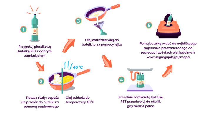 Jak segregować olej? Przygotuj pustą butelkę PET, np. po wodzie czy mleku. Ostudzony olej ostrożnie przelej do butelki, użyj lejka i papierowego ręcznika dla bezpieczeństwa. Następnie szczelnie zakręć butelkę i schowaj np. pod zlew. Butelkę napełniaj stopniowo, a dopiero, gdy będzie pełna, wrzuć ją do najbliższego pojemnika na zużyte oleje i tłuszcze w swojej okolicy. Znajdziesz go na mapie: www.segregujolej.pl/mapa/.