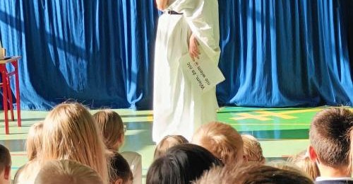 Podczas uroczystej akademii przenieśliśmy się w czasie i zobaczyliśmy, jak wyglądał „uczeń przez wieki” – od tabliczki glinianej po tableta!