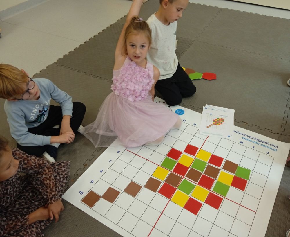 W miesiącu wrześniu dzieci z gr. Kotki realizowały trzy tematy -Witamy w przedszkolu, Ja, ty, my - tworzymy zakodowany grupowy kodeks, Dary jesieni. Poprzez zabawy offline i online zapoznały się z matą do kodowania- posługiwały  się pojęciami: w prawo, w lewo, do góry, w dół , odszukiwały na macie pole określone za pomocą dwóch współrzędnych, miały możliwość  tworzenia  logicznych  instrukcji  dotyczących  codziennych czynności, układały kody z wykorzystaniem symboli. Poznały robota Ozobot Bit  oraz zasady  jego sterowania - za pomocą kolorowych kodów programowały robota, tak aby poruszał się po wyznaczonej trasie.
