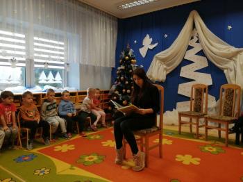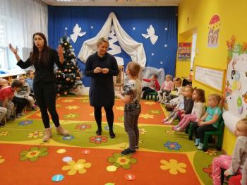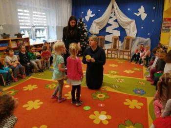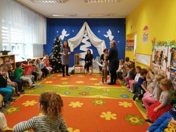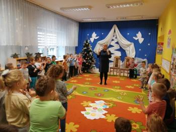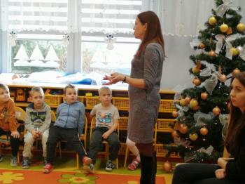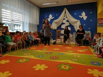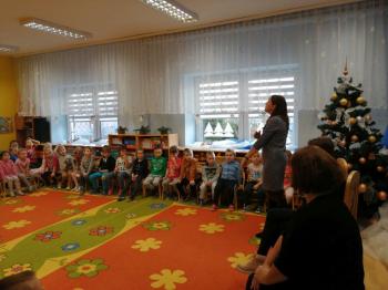 w okresie przedświątecznym? Na te pytania przedszkolaki szukały odpowiedzi realizując kolejny moduł Międzynarodowego Projektu Czytelniczego „Magiczna moc bajek”. Aby przybliżyć dzieciom tematykę zaprosiliśmy eksperta Panią Dyrektor Gminnego Ośrodka Pomocy Społecznej w Grojcu Annę Chojnacką oraz Panią bibliotekarkę Agnieszkę Górkiewicz. Tematyka trudna dla dzieci w wieku przedszkolnym ale pani dyrektor przeprowadziła wspaniałą prelekcję
